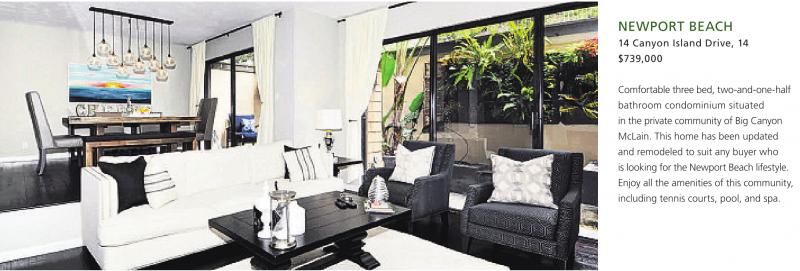 NEWPORT BEACH 14 Canyon Island Drive, 14 $739,000 Comfortable three bed, two-and-one-half bathroom condominium situated in the private community of Big Canyon McLain. This home has been updated and remodeled to suit any buyer who is looking for the Newport Beach lifestyle. Enjoy all the amenities of this community, including tennis courts, pool, and spa. See also