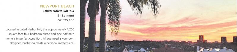 NEWPORT BEACH Open House Sat 1-4 21 Belmont $2,895,000 Located in gated Harbor Hill, this approximately 4,200 square foot four bedroom, three-and-one-half bath home is in perfect condition. All you need is your own designer touches to create a personal masterpiece. See also