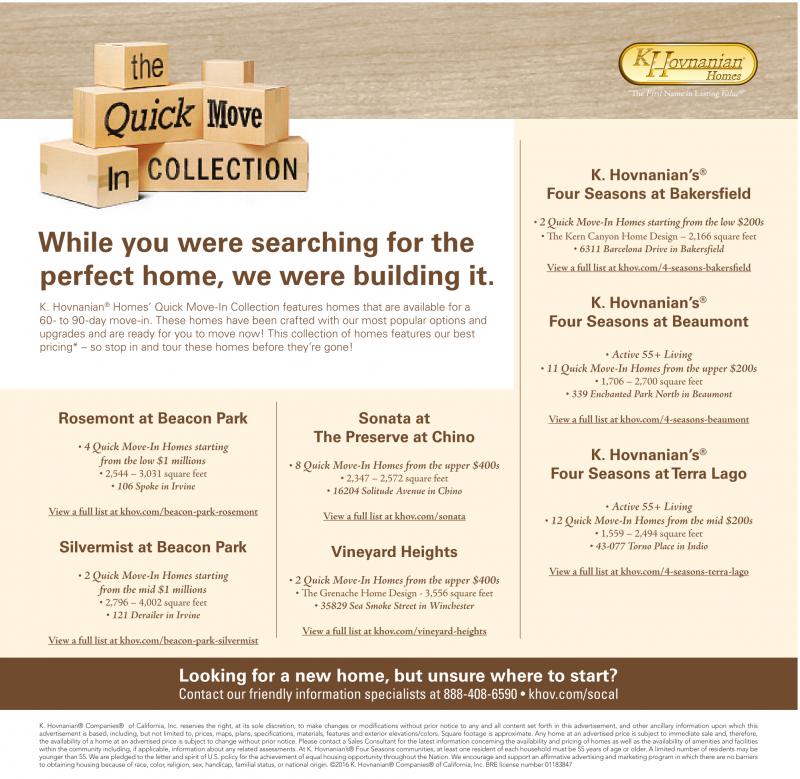 K. Hovnanian® Companies® of California, Inc. reserves the right, at its sole discretion, to make changes or modifications without prior notice to any and all content set forth in this advertisement, and other ancillary information upon which this advertisement is based, including, but not limited to, prices, maps, plans, specifications, materials, features and exterior elevations/colors. Square footage is approximate. Any home at an advertised price is subject to immediate sale and, therefore, the availability of ahome at an advertised price is subject to change without prior notice. Please contact aSales Consultant for the latest information concerning the availability and pricing of homes as well as the availability of amenities and facilities within the community including, if applicable, information about any related assessments. At K. Hovnanian’s® Four Seasons communities, at least one resident of each household must be 55 years of age or older.Alimited number of residents may be younger than 55. We arepledged to the letter and spirit of U.S. policy for the achievement of equal housing opportunity throughout the Nation. We encourageand support an affirmative advertising and marketing program in which thereare no barriers to obtaining housing because of race, color,religion, sex, handicap, familial status, or national origin. ©2016 K. Hovnanian® Companies® of California, Inc. BRE license number 01183847