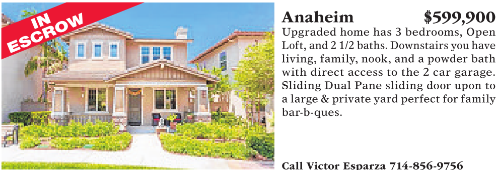 Anaheim $599,900 Upgraded home has 3 bedrooms, Open Loft,and 21/2 baths. Downstairs youhave living, family, nook, and a powder bath with direct access to the 2 car garage. Sliding Dual Pane sliding door upon to alarge &private yard perfect forfamily bar-b-ques. Call Victor Esparza 714-856-9756