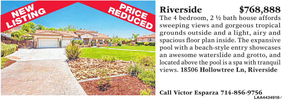 Riverside $768,888 The 4 bedroom, 2 ½ bath house affords sweeping views and gorgeous tropical grounds outside and a light, airy and spacious floorplaninside.The expansive poolwithabeach-style entryshowcases an awesome waterslide and grotto, and locatedabove thepoolisaspa with tranquil views. 18506 Hollowtree Ln, Riverside Call Victor Esparza 714-856-9756 LAA4434918-1