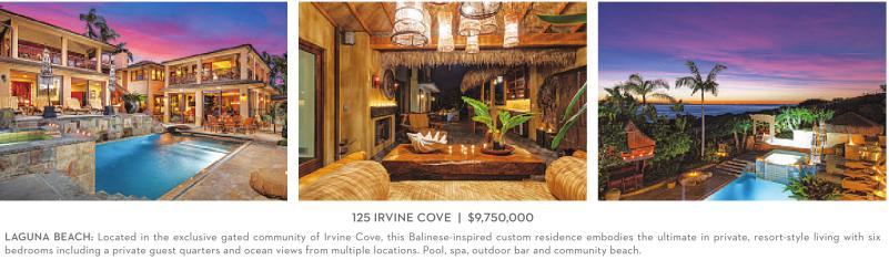 125 IRVINE COVE | $9,750,000 LAGUNA BEACH: Located in the exclusive gated community of Irvine Cove, this Balinese-inspired custom residence embodies the ultimate in private, resort-style living with six bedrooms including a private guest quarters and ocean views from multiple locations. Pool, spa, outdoor bar and community beach.