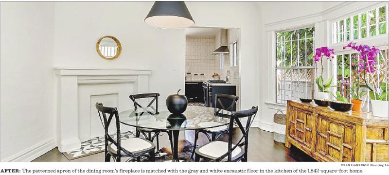 AFTER: The patterned apron of the dining room’s fireplace is matched with the gray and white encaustic floor in the kitchen of the 1,842-square-foot home.