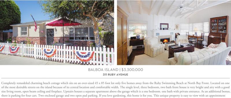 BALBOA ISLAND | $3,300,000 311 ruby avenue Completely remodeled charming beach cottage which sits on an over-sized 45 x 85 foot lot only five homes away from the Ruby Swimming Beach at North Bay Front. Located on one of the most desirable streets on the island because of its central location and comfortable width. The single level, three bedroom, two bath front house is very bright and airy with a good size living room, open beam ceiling and fireplace. Upstairs houses a separate apartment above the garage which is a one bedroom. one bath with private entrance. As an additional bonus, there is parking for four cars. Two enclosed garage and two open pad parking. If you love gardening, this home is for you. This unique property is easy to view with an appointment