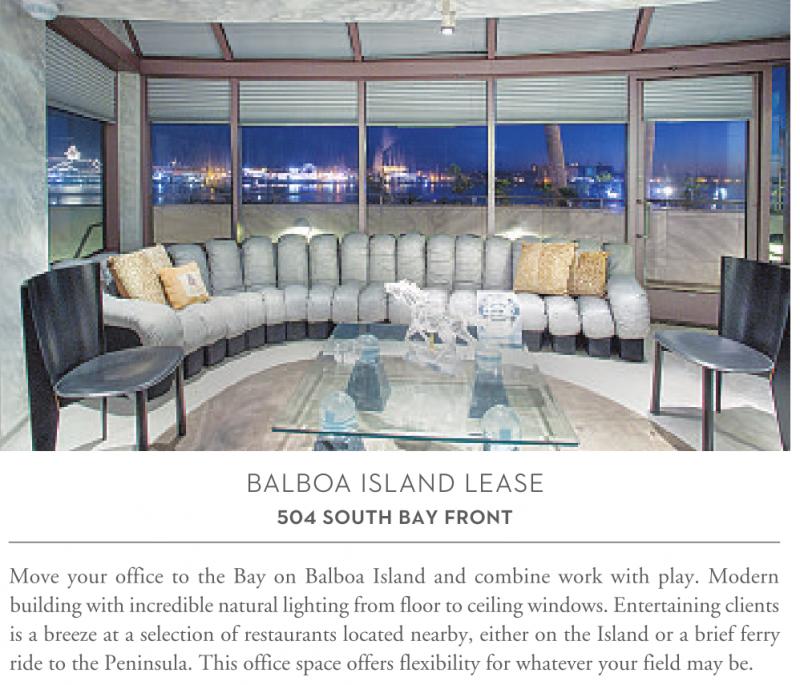 BALBOA ISLAND LEASE 504 south bay front Move your office to the Bay on Balboa Island and combine work with play. Modern building with incredible natural lighting from floor to ceiling windows. Entertaining clients is a breeze at a selection of restaurants located nearby, either on the Island or a brief ferry ride to the Peninsula. This office space offers flexibility for whatever your field may be.