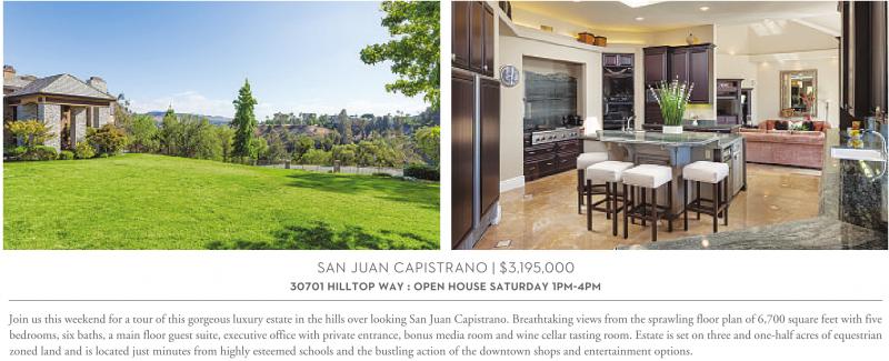 SAN JUAN CAPISTRANO | $3,195,000 30701 hilltop way : open house saturday 1pm-4pm Join us this weekend for a tour of this gorgeous luxury estate in the hills over looking San Juan Capistrano. Breathtaking views from the sprawling floor plan of 6,700 square feet with five bedrooms, six baths, a main floor guest suite, executive office with private entrance, bonus media room and wine cellar tasting room. Estate is set on three and one-half acres of equestrian zoned land and is located just minutes from highly esteemed schools and the bustling action of the downtown shops and entertainment options.