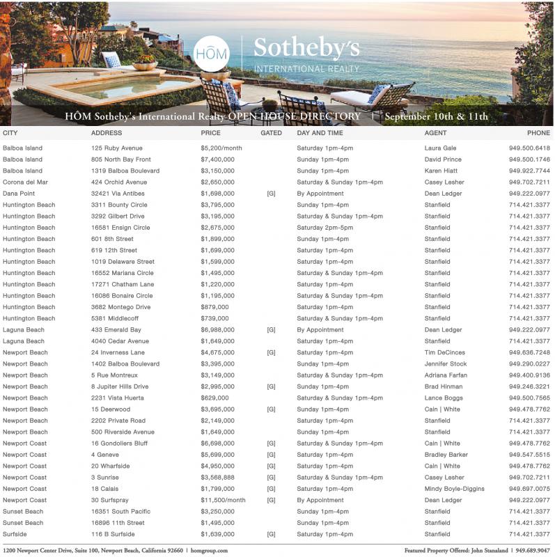 CITY ADDRESS PRICE GATED DAY AND TIME AGENT PHONE Balboa Island 125 Ruby Avenue $5,200/month Saturday 1pm-4pm Laura Gale 949.500.6418 Balboa Island 805 North Bay Front $7,400,000 Sunday 1pm-4pm David Prince 949.500.1746 Balboa Island 1319 Balboa Boulevard $3,150,000 Sunday 1pm-4pm Karen Hiatt 949.922.7744 Corona del Mar 424 Orchid Avenue $2,650,000 Saturday & Sunday 1pm-4pm Casey Lesher 949.702.7211 Dana Point 32421 Via Antibes $1,698,000 [G] By Appointment Dean Ledger 949.222.0977 Huntington Beach 3311 Bounty Circle $3,795,000 Sunday 1pm-4pm Stanfield 714.421.3377 Huntington Beach 3292 Gilbert Drive $3,195,000 Saturday & Sunday 1pm-4pm Stanfield 714.421.3377 Huntington Beach 16581 Ensign Circle $2,675,000 Saturday 2pm-5pm Stanfield 714.421.3377 Huntington Beach 601 8th Street $1,899,000 Sunday 1pm-4pm Stanfield 714.421.3377 Huntington Beach 619 12th Street $1,699,000 Saturday 1pm-4pm Stanfield 714.421.3377 Huntington Beach 1019 Delaware Street $1,599,000 Saturday 1pm-4pm Stanfield 714.421.3377 Huntington Beach 16552 Mariana Circle $1,495,000 Saturday & Sunday 1pm-4pm Stanfield 714.421.3377 Huntington Beach 17271 Chatham Lane $1,220,000 Saturday 1pm-4pm Stanfield 714.421.3377 Huntington Beach 16086 Bonaire Circle $1,195,000 Saturday & Sunday 1pm-4pm Stanfield 714.421.3377 Huntington Beach 3682 Montego Drive $879,000 Saturday 1pm-4pm Stanfield 714.421.3377 Huntington Beach 5381 Middlecoff $739,000 Saturday & Sunday 1pm-4pm Stanfield 714.421.3377 Laguna Beach 433 Emerald Bay $6,988,000 [G] By Appointment Dean Ledger 949.222.0977 Laguna Beach 4040 Cedar Avenue $1,649,000 Saturday 1pm-4pm Stanfield 714.421.3377 Newport Beach 24 Inverness Lane $4,675,000 [G] Saturday 1pm-4pm Tim DeCinces 949.636.7248 Newport Beach 1402 Balboa Boulevard $3,395,000 Sunday 1pm-4pm Jennifer Stock 949.290.0227 Newport Beach 5 Rue Montreux $3,149,000 Saturday & Sunday 1pm-4pm Adriana Farfan 949.400.9136 Newport Beach 8 Jupiter Hills Drive $2,995,000 [G] Sunday 1pm-4pm Brad Hinman 949.246.3221 Newport Beach 2231 Vista Huerta $629,000 Saturday & Sunday 1pm-4pm Lance Boggs 949.500.7565 Newport Beach 15 Deerwood $3,695,000 [G] Sunday 1pm-4pm Cain | White 949.478.7762 Newport Beach 2202 Private Road $2,149,000 Saturday 1pm-4pm Stanfield 714.421.3377 Newport Beach 500 Riverside Avenue $1,649,000 Sunday 1pm-4pm Stanfield 714.421.3377 Newport Coast 16 Gondoliers Bluff $6,698,000 [G] Saturday & Sunday 1pm-4pm Cain | White 949.478.7762 Newport Coast 4 Geneve $5,699,000 [G] Saturday 1pm-4pm Bradley Barker 949.547.5515 Newport Coast 20 Wharfside $4,950,000 [G] Saturday 1pm-4pm Cain | White 949.478.7762 Newport Coast 3 Sunrise $3,568,888 [G] Saturday & Sunday 1pm-4pm Casey Lesher 949.702.7211 Newport Coast 18 Calais $1,799,000 [G] Saturday 1pm-4pm Mindy Boyle-Diggins 949.697.0075 Newport Coast 30 Surfspray $11,500/month [G] By Appointment Dean Ledger 949.222.0977 Sunset Beach 16351 South Pacific $3,250,000 Sunday 1pm-4pm Stanfield 714.421.3377 Sunset Beach 16896 11th Street $1,495,000 Sunday 1pm-4pm Stanfield 714.421.3377 Surfside 116 B Surfside $1,639,000 [G] Saturday 1pm-4pm Stanfield 714.421.3377