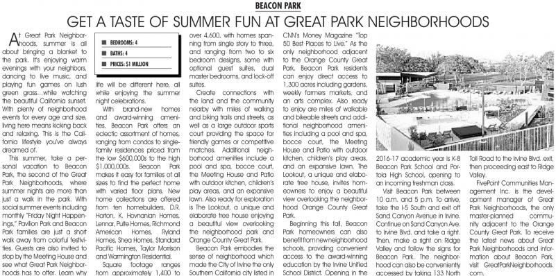 FivePoint Communities Management Inc. is the development manager of Great Park Neighborhoods, the only master-planned community adjacent to the orange County Great Park. To receive the latest news about Great Park Neighborhoods and information about Beacon Park, visit GreatParkNeighborhoods. com.