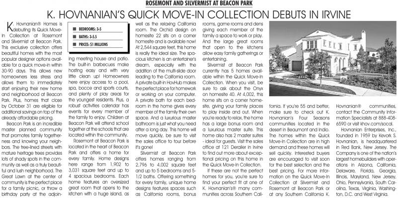 If you’re 55 and better, make sure to check out k. Hovnanian’s Four seasons communities located in the desert in Beaumont and Indio. The homes within the Quick Move-In Collection are in high demand and these homes will sell quickly. Interested buyers are encouraged to visit soon for the best selection and the best pricing. For more information on the Quick Move-In Collection at silvermist and rosemont at Beacon Park or at any southern California k.