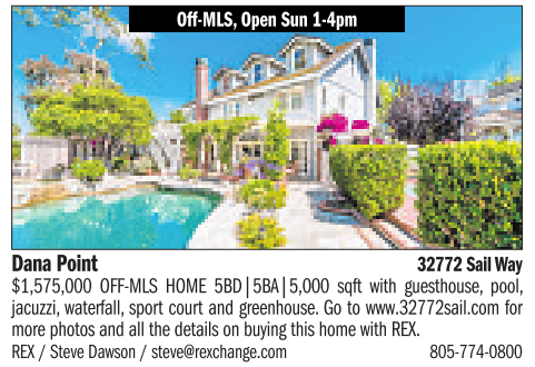 Off-MLS, Open Sun 1-4pm Dana Point 32772 Sail Way $1,575,000 OFF-MLS HOME 5BD|5BA|5,000 sqft with guesthouse, pool, jacuzzi, waterfall, sportcourtand greenhouse.Gotowww.32772sail.com for more photos and all the details on buying this home with REX. REX/Steve Dawson /steve@rexchange.com 805-774-0800