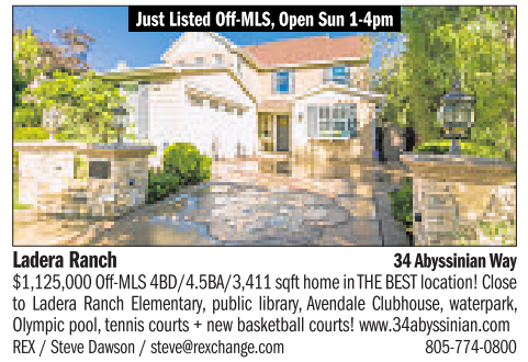 Just Listed Off-MLS, Open Sun 1-4pm Ladera Ranch 34 Abyssinian Way $1,125,000 Off-MLS 4BD/4.5BA/3,411 sqft home inTHE BEST location! Close to Ladera Ranch Elementary, public library,Avendale Clubhouse, waterpark, Olympic pool, tennis courts +new basketball courts! www.34abyssinian.com REX /Steve Dawson /steve@rexchange.com 805-774-0800