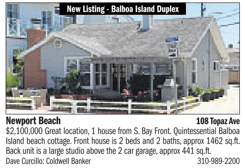 NewListing -Balboa Island Duplex NewportBeach 108Topaz Ave $2,100,000 Great location, 1house from S. Bay Front. Quintessential Balboa Island beach cottage. Front house is 2beds and 2baths,approx 1462 sq.ft. Back unit is alarge studio above the 2car garage, approx 441 sq.ft. DaveCurcillo:ColdwellBanker 310-989-2200