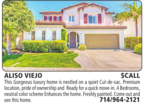 ALISO VIEJO $CALL This Gorgeous luxury home is nestled on aquiet Cul-de-sac. Premium location,pride of ownership and Readyfor aquickmove-in. 4Bedrooms, neutral color scheme Enhances thehome.Freshlypainted. Come outand seethis home. 714/964-2121