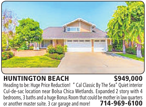 HUNTINGTON BEACH $949,000 Headingtobe: HugePrice Reduction! “Cal ClassicByThe Sea” Quietinterior Cul-de-sac location near Bolsa Chica Wetlands. Expanded 2story with 4 bedrooms,3baths andahugeBonus Room that couldbemother in law quarters or another master suite. 3car garageand more! 714-969-6100