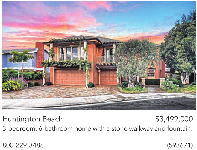 Huntington Beach $3,499,000 3-bedroom, 6-bathroom home with astone walkway and fountain.