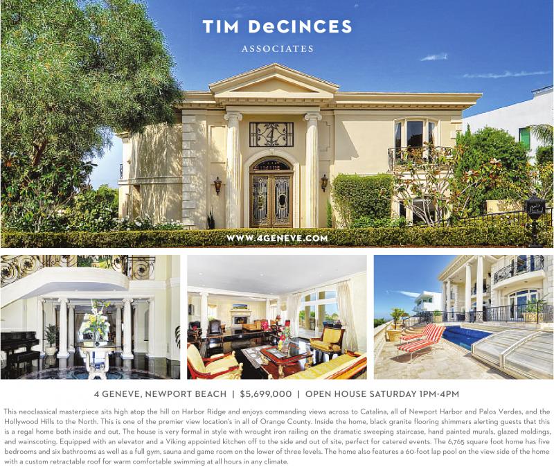 WWW.4GENEVE.COM 4 GENEVE, NEWPORT BEACH | $5,699,000 | OPEN HOUSE SATURDAY 1PM-4PM This neoclassical masterpiece sits high atop the hill on Harbor Ridge and enjoys commanding views across to Catalina, all of Newport Harbor and Palos Verdes, and the Hollywood Hills to the North. This is one of the premier view location's in all of Orange County. Inside the home, black granite flooring shimmers alerting guests that this is a regal home both inside and out. The house is very formal in style with wrought iron railing on the dramatic sweeping staircase, hand painted murals, glazed moldings, and wainscoting. Equipped with an elevator and a Viking appointed kitchen off to the side and out of site, perfect for catered events. The 6,765 square foot home has five bedrooms and six bathrooms as well as a full gym, sauna and game room on the lower of three levels. The home also features a 60-foot lap pool on the view side of the home with a custom retractable roof for warm comfortable swimming at all hours in any climate.