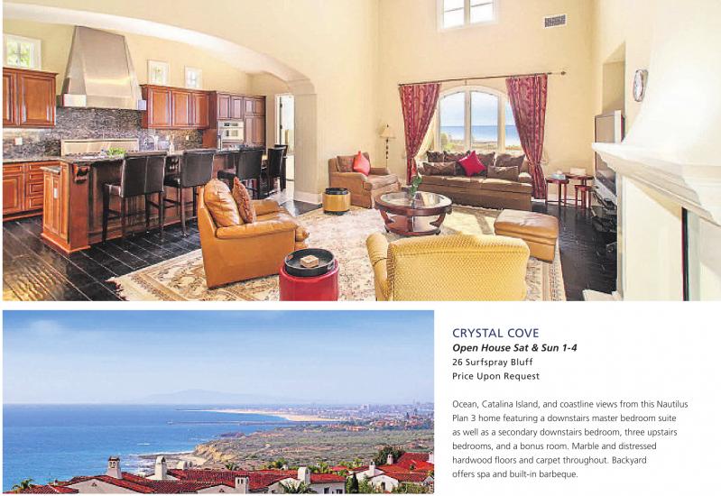 CRYSTAL COVE Open House Sat & Sun 1-4 26 Surfspray Bluff Price Upon Request Ocean, Catalina Island, and coastline views from this Nautilus Plan 3 home featuring a downstairs master bedroom suite as well as a secondary downstairs bedroom, three upstairs bedrooms, and a bonus room. Marble and distressed hardwood floors and carpet throughout. Backyard offers spa and built-in barbeque.
