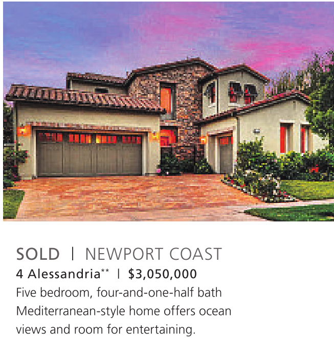4 Alessandria ** | $3,050,000 Five bedroom, four-and-one-half bath Mediterranean-style home offers ocean views and room for entertaining.