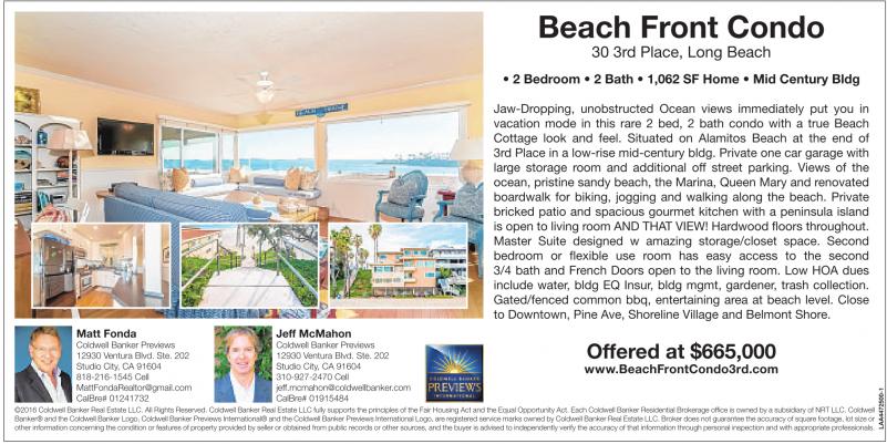 Jaw-Dropping, unobstructed Ocean views immediately put you in vacation mode in this rare 2 bed, 2 bath condo with a true Beach Cottage look and feel. Situated on Alamitos Beach at the end of 3rd Place in a low-rise mid-century bldg. Private one car garage with large storage room and additional off street parking. Views of the ocean, pristine sandy beach, the Marina, Queen Mary and renovated boardwalk for biking, jogging and walking along the beach. Private bricked patio and spacious gourmet kitchen with a peninsula island is open to living room AND THAT VIEW! Hardwood floors throughout. Master Suite designed w amazing storage/closet space. Second bedroom or flexible use room has easy access to the second 3/4 bath and French Doors open to the living room. Low HOA dues include water, bldg EQ Insur, bldg mgmt, gardener, trash collection. Gated/fenced common bbq, entertaining area at beach level. Close to Downtown, Pine Ave, Shoreline Village and Belmont Shore.
