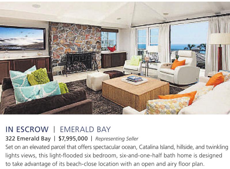 IN ESCROW | EMERALD BAY 322 Emerald Bay | $7,995,000 | Representing Seller Set on an elevated parcel that offers spectacular ocean, Catalina Island, hillside, and twinkling lights views, this light-flooded six bedroom, six-and-one-half bath home is designed to take advantage of its beach-close location with an open and airy floor plan. See also