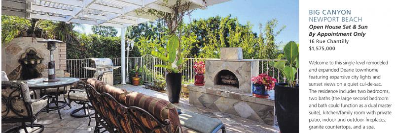 BIG CANYON NEWPORT BEACH Open House Sat & Sun By Appointment Only 16 Rue Chantilly $1,575,000 Welcome to this single-level remodeled and expanded Deane townhome featuring expansive city lights and sunset views on a quiet cul-de-sac. The residence includes two bedrooms, two baths (the large second bedroom and bath could function as a dual master suite), kitchen/family room with private patio, indoor and outdoor fireplaces, granite countertops, and a spa.