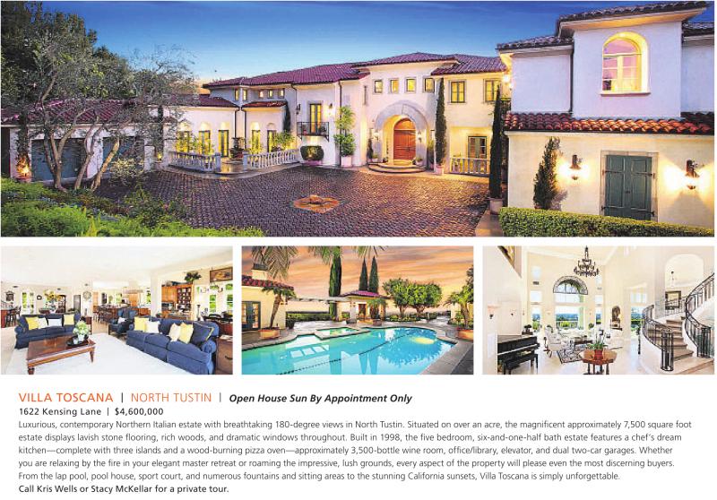 VILLA TOSCANA | NORTH TUSTIN | Open House Sun By Appointment Only 1622 Kensing Lane | $4,600,000 Luxurious, contemporary Northern Italian estate with breathtaking 180-degree views in North Tustin. Situated on over an acre, the magnificent approximately 7,500 square foot estate displays lavish stone flooring, rich woods, and dramatic windows throughout. Built in 1998, the five bedroom, six-and-one-half bath estate features a chef’s dream kitchen—complete with three islands and a wood-burning pizza oven—approximately 3,500-bottle wine room, office/library, elevator, and dual two-car garages. Whether you are relaxing by the fire in your elegant master retreat or roaming the impressive, lush grounds, every aspect of the property will please even the most discerning buyers. From the lap pool, pool house, sport court, and numerous fountains and sitting areas to the stunning California sunsets, Villa Toscana is simply unforgettable. Call Kris Wells or Stacy McKellar for a private tour.