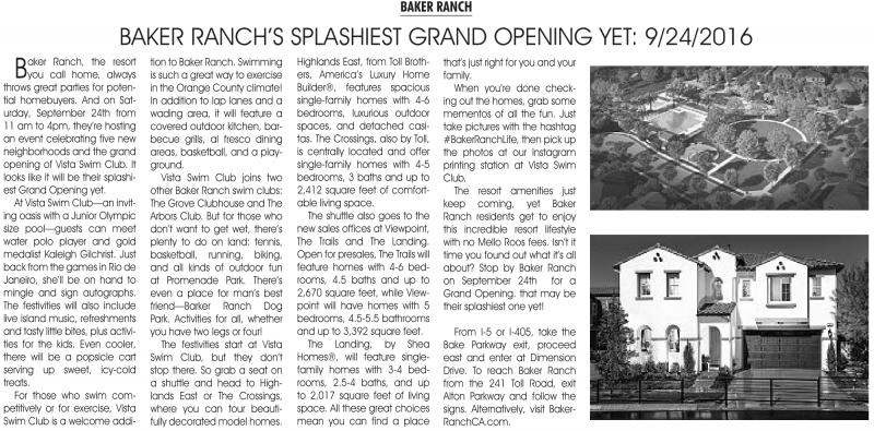 tion to Baker Ranch. Swimming is such a great way to exercise in the Orange County climate! In addition to lap lanes and a wading area, it will feature a covered outdoor kitchen, barbecue grills, al fresco dining areas, basketball, and a playground.