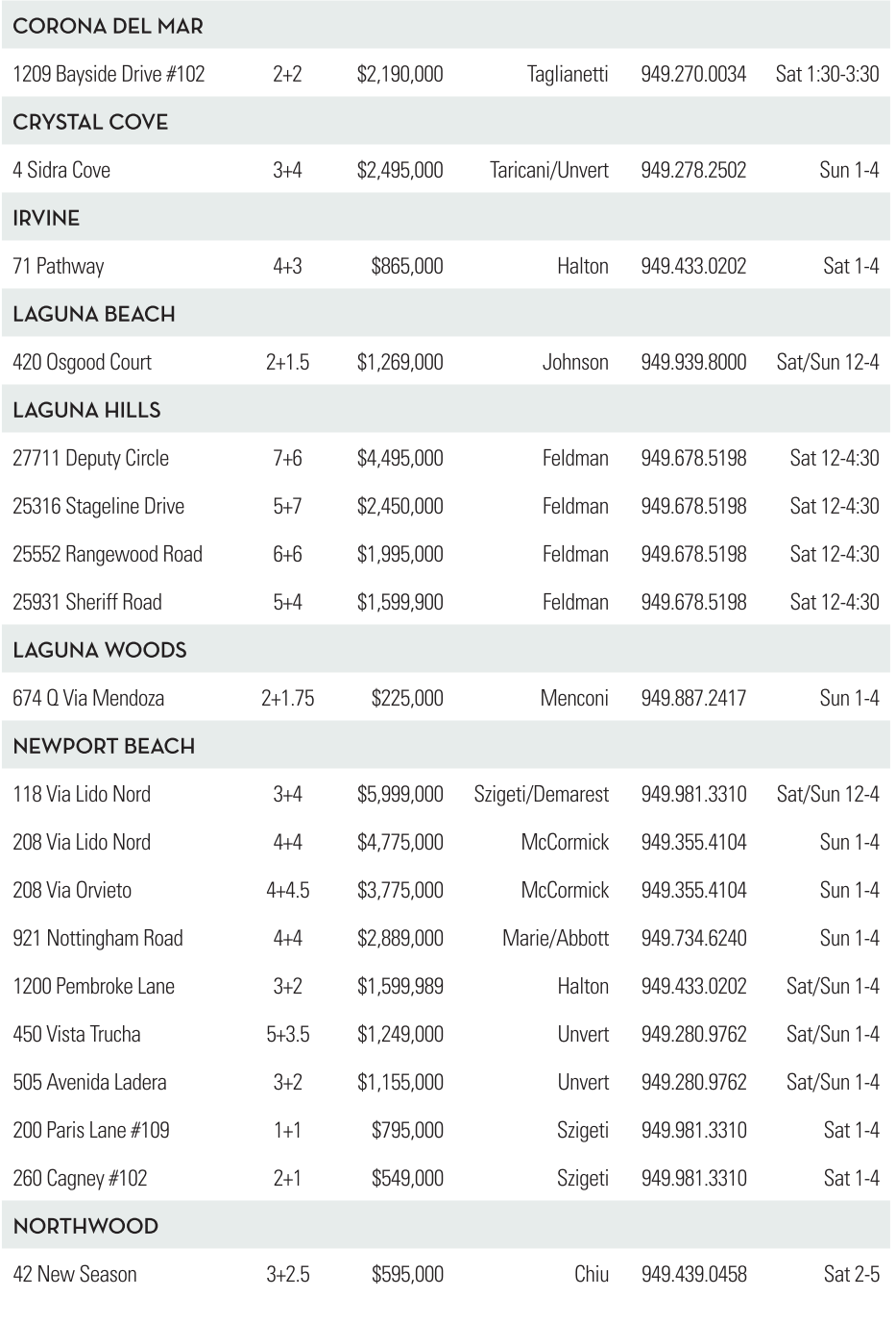 CORONA DEL MAR 1209 Bayside Drive #102 2+2 $2,190,000 Taglianetti 949.270.0034 Sat 1:30-3:30 CRYSTALCOVE 4Sidra Cove 3+4 $2,495,000 Taricani/Unvert 949.278.2502 Sun 1-4 IRVINE 71 Pathway 4+3 $865,000 Halton 949.433.0202 Sat 1-4
