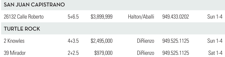 SANJUANCAPISTRANO 26132 Calle Roberto 5+6.5 $3,899,999 Halton/Aballi 949.433.0202 Sun 1-4 TURTLE ROCK 2Knowles 4+3.5 $2,495,000 DiRienzo 949.525.1125 Sun 1-4 39 Mirador 2+2.5 $979,000 DiRienzo 949.525.1125 Sat 1-4