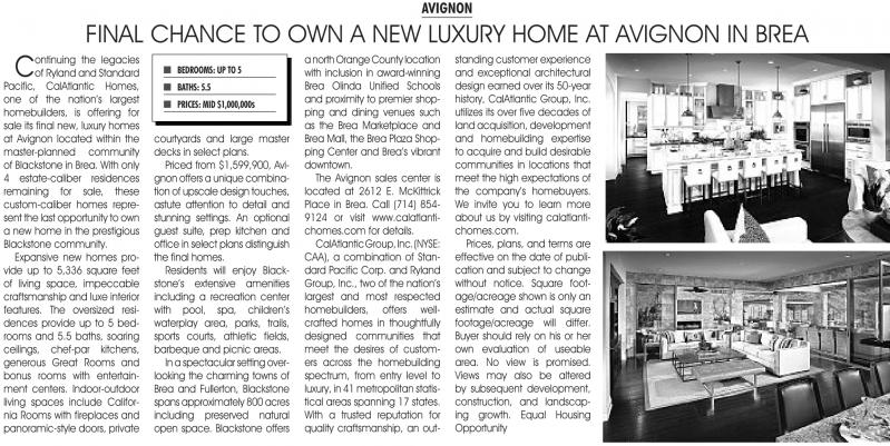 one of the nation’s largest homebuilders, is offering for sale its final new, luxury homes at Avignon located within the master-planned community of Blackstone in Brea. With only 4 estate-caliber residences remaining for sale, these custom-caliber homes represent the last opportunity to own a new home in the prestigious Blackstone community.