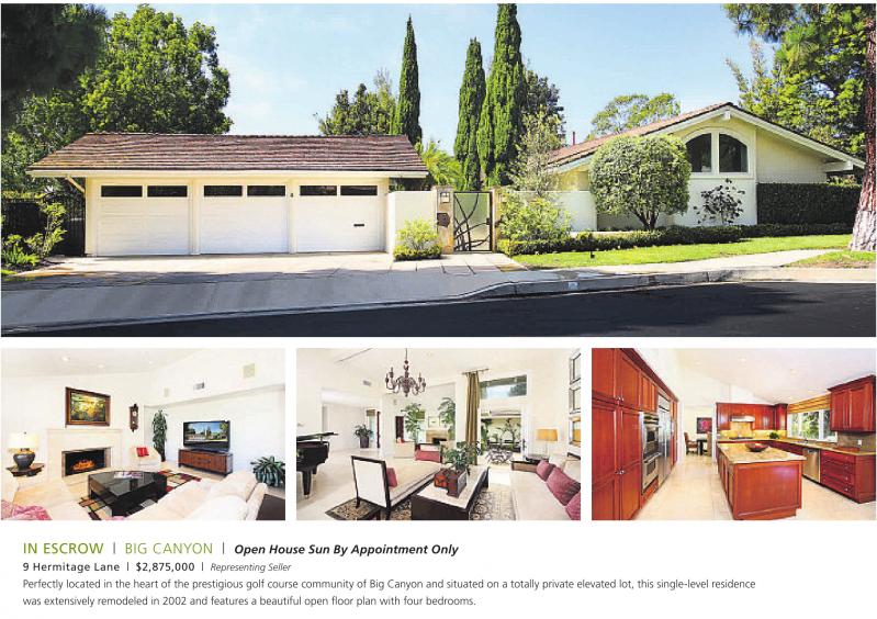 IN ESCROW | BIG CANYON | Open House Sun By Appointment Only 9 Hermitage Lane | $2,875,000 | Representing Seller Perfectly located in the heart of the prestigious golf course community of Big Canyon and situated on a totally private elevated lot, this single-level residence was extensively remodeled in 2002 and features a beautiful open floor plan with four bedrooms.
