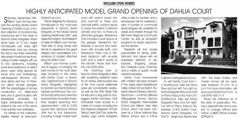 24th, the Sales Gallery and model homes will be open daily between 10 a.m. to 6 p.m. Formore information, visit www.LyonDahliaCourt.com or call (949) 408-3114 Prices are effective as of the date of publication. Pricing is approximate and is subject to change without prior notice. CalBRe Officer License: 00982816.