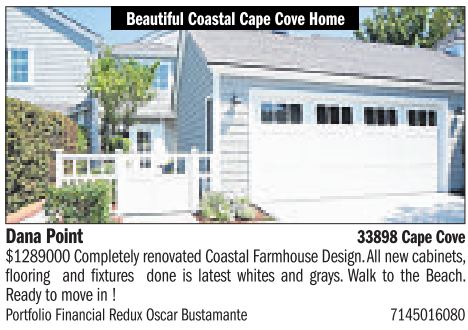 Beautiful Coastal Cape Cove Home Dana Point 33898Cape Cove $1289000 Completely renovated Coastal Farmhouse Design.All newcabinets, flooring and fixtures done is latest whites and grays. Walk to the Beach. Ready to move in ! PortfolioFinancialRedux Oscar Bustamante 7145016080