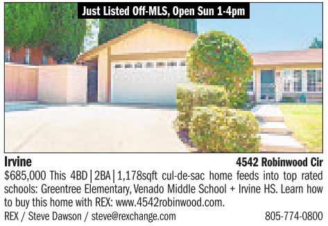 Irvine 4542 Robinwood Cir $685,000 This 4BD|2BA|1,178sqft cul-de-sac home feeds into top rated schools: Greentree Elementary,Venado Middle School +IrvineHS. Learnhow to buy this home with REX: www.4542robinwood.com. REX /Steve Dawson /steve@rexchange.com 805-774-0800