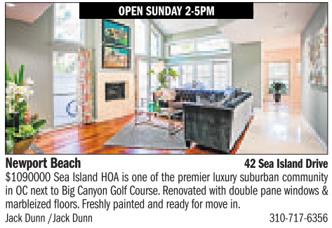 NewportBeach 42 SeaIslandDrive $1090000 Sea Island HOA is one of the premier luxury suburban community in OC next to Big Canyon Golf Course. Renovatedwith double pane windows & marbleized floors. Freshly painted and ready for move in. JackDunn/JackDunn 310-717-6356