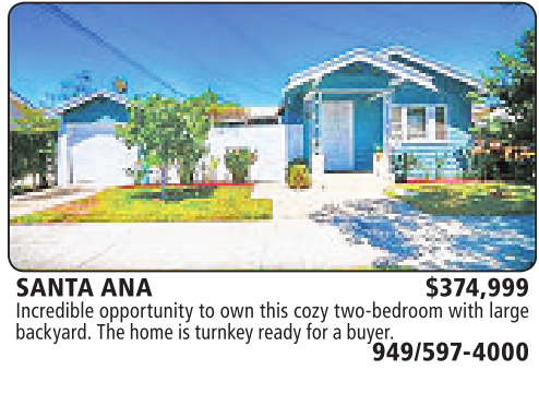 SANTA ANA $374,999 Incredible opportunity toown this cozy two-bedroom with large backyard. Thehomeisturnkey readyfor abuyer. 949/597-4000