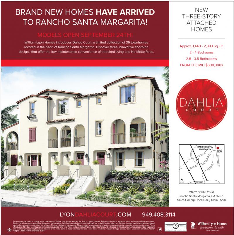 BRAND NEW HOMES HAVE ARRIVED TO RANCHO SANTA MARGARITA! MODELS OPEN SEPTEMBER 24TH! William Lyon Homes introduces Dahlia Court, a limited collection of 36 townhomes located in the heart of Rancho Santa Margarita. Discover three innovative floorplan designs that offer the low-maintenance convenience of attached living and No Mello Roos. NEW THREE-STORY ATTACHED HOMES Approx. 1,440 - 2,083 Sq. Ft. 2 - 4 Bedrooms 2.5 - 3.5 Bathrooms FROM THE MID $500,000s LYONDAHLIACOURT.COM 949.408.3114 In our continuing policy of research and improvement, William Lyon Homes reserves the right to change product, design specifications, materials, prices and terms without prior notice. Product type is subject to availability.Some room configurations, including but not limited to those indicated, are available only on select lots. Optional features may be included at additional cost and are subject to construction cut-off dates. All square footage is approximate. All maps, plans, landscaping and elevation renderings are artist conceptions and are not to scale. Prices effective as of the date of publication. All homes are subject to prior sale. Prices and availability of homes subject to change without notice. Architectural elements such as window placement and porches vary according to exterior elevation of the home. Some of these variances may also cause minor variations in square footage. See your Sales Counselors for details. Wendy Wagner CalBRE license #01372598. 9/2016. RANCHO SANTA MARGARITA DAHLIA COURT N MAP NOT TO SCALE 21402 Dahlia Court Rancho Santa Margarita, CA 92679 Sales Gallery Open Daily 10am - 5pm