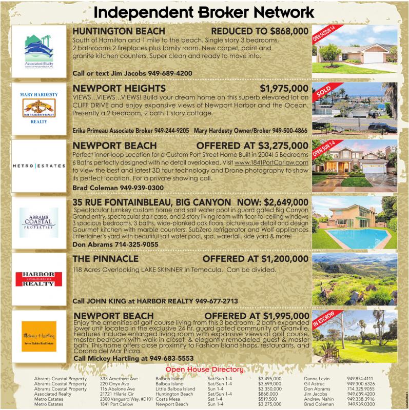 Abrams Coastal Property 333 Amethyst Ave Balboa Island Sat/Sun 1-4 $3,495,000 Danna Levin 949.874.4111 Abrams Coastal Property 220 Onyx Ave Balboa Island Sat/Sun 1-4 $3,699,000 Gil Astruc 949.300.6326 Abrams Coastal Property 116 Abalone Ave Little Balboa Island Sun 1-4 $3,350,000 Don Abrams 714.325.9055 Associated Realty 21721 Hilaria Cir Huntington Beach Sat/Sun 1-4 $868,000 Jim Jacobs 949.689.4200 Metro Estates 2300 Vanguard Way, #D101 Costa Mesa Sat 1-4 $519,500 Andrew Nahin 949.338.3916 Metro Estates 1841 Port Carlow Newport Beach Sun 1-4 $3,275,000 Brad Coleman 949.939.0300