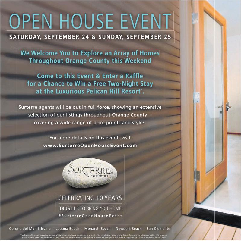 OPEN HOUSE EVENT SATURDAY, SEPTEMBER 24 & SUNDAY, SEPTEMBER 25 We Welcome You to Explore an Array of Homes Throughout Orange County this Weekend Come to this Event & Enter a Raffle for a Chance to Win a Free Two-Night Stay at the Luxurious Pelican Hill Resort * . Surterre agents will be out in full force, showing an extensive selection of our listings throughout Orange County— covering a wide range of price points and styles. For more details on this event, visit www.SurterreOpenHouseEvent.com CELEBRATING 10 YEARS # S u r t e r r e O p e n H o u s e E v e n t Corona del Mar | Irvine | Laguna Beach | Monarch Beach | Newport Beach | San Clemente ente * Employees of Surterre Properties, Inc. and affiliated companies and their immediate families are not eligible to participate. Taxes, if any, are the sole responsibility of the winner. All matters not specifically addressed in these rules shall be determined at the sole discretion of the management of Surterre Properties, Inc. Surterre Properties BRE#01778230