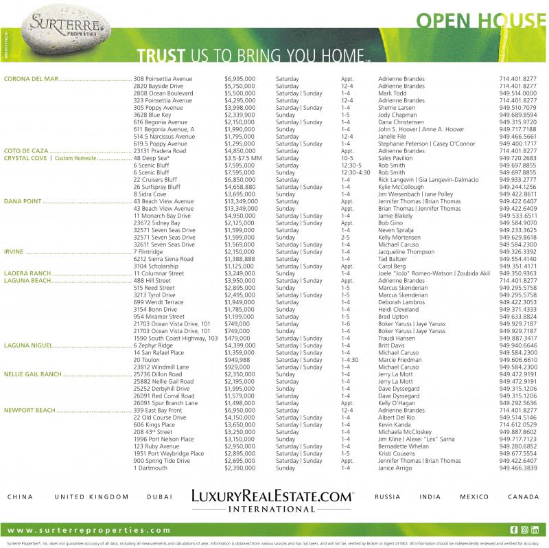CORONA DEL MAR ........................................... 308 Poinsettia Avenue $6,995,000 Saturday Appt. Adrienne Brandes 714.401.8277 2820 Bayside Drive $5,750,000 Saturday 12-4 Adrienne Brandes 714.401.8277 2808 Ocean Boulevard $5,500,000 Saturday | Sunday 1-4 Mark Todd 949.514.0000 323 Poinsettia Avenue $4,295,000 Saturday 12-4 Adrienne Brandes 714.401.8277 305 Poppy Avenue $3,998,000 Saturday | Sunday 1-4 Sherrie Larsen 949.510.7079 3628 Blue Key $2,339,900 Sunday 1-5 Jody Chapman 949.689.8594 616 Begonia Avenue $2,150,000 Saturday | Sunday 1-4 Dana Christensen 949.315.9720 611 Begonia Avenue, A $1,990,000 Sunday 1-4 John S. Hoover | Anne A. Hoover 949.717.7188 514.5 Narcissus Avenue $1,795,000 Saturday 12-4 Janelle File 949.466.5661 619.5 Poppy Avenue $1,295,000 Saturday | Sunday 1-4 Stephanie Peterson | Casey O'Connor 949.400.1717 COTO DE CAZA................................................. 23131 Pradera Road $4,850,000 Saturday Appt. Adrienne Brandes 714.401.8277 CRYSTAL COVE | CustomHomesite..................... 48 Deep Sea* $3.5-$7.5 MM Saturday 10-5 Sales Pavilion 949.720.2683 6 Scenic Bluff $7,595,000 Saturday 12:30-5 Rob Smith 949.697.8855 6 Scenic Bluff $7,595,000 Sunday 12:30-4:30 Rob Smith 949.697.8855 22 Cruisers Bluff $6,850,000 Saturday 1-4 Rick Langevin | Gia Langevin-Dalmacio 949.933.2777 26 Surfspray Bluff $4,658,880 Saturday | Sunday 1-4 Kylie McCollough 949.244.1256 8 Sidra Cove $3,695,000 Sunday 1-4 Jim Weisenbach | Jane Polley 949.422.8611 DANA POINT ..................................................... 43 Beach View Avenue $13,349,000 Saturday Appt. Jennifer Thomas | Brian Thomas 949.422.6407 43 Beach View Avenue $13,349,000 Sunday Appt. Brian Thomas | Jennifer Thomas 949.422.6409 11 Monarch Bay Drive $4,950,000 Saturday | Sunday 1-4 Jamie Blakely 949.533.6511 23672 Sidney Bay $2,125,000 Saturday | Sunday Appt. Bob Gino 949.584.9070 32571 Seven Seas Drive $1,599,000 Saturday 1-4 Neven Spralja 949.233.3625 32571 Seven Seas Drive $1,599,000 Sunday 2-5 Kelly Mortensen 949.629.8618 32611 Seven Seas Drive $1,569,000 Saturday | Sunday 1-4 Michael Caruso 949.584.2300 IRVINE ............................................................... 7 Flintridge $2,150,000 Saturday | Sunday 1-4 Jacqueline Thompson 949.326.3392 6212 Sierra Siena Road $1,388,888 Saturday 1-4 Tad Baltzer 949.554.4140 3104 Scholarship $1,125,000 Saturday | Sunday Appt. Carol Berg 949.351.4171 LADERA RANCH................................................ 11 Columnar Street $3,249,000 Sunday 1-4 Joele "JoJo" Romeo-Watson | Zoubida Akil 949.350.9363 LAGUNA BEACH................................................ 488 Hill Street $3,950,000 Saturday | Sunday Appt. Adrienne Brandes 714.401.8277 515 Reed Street $2,895,000 Sunday 1-5 Marcus Skenderian 949.295.5758 3213 Tyrol Drive $2,495,000 Saturday | Sunday 1-5 Marcus Skenderian 949.295.5758 699 Wendt Terrace $1,949,000 Saturday 1-4 Deborah Lambros 949.422.3053 3154 Bonn Drive $1,785,000 Sunday 1-4 Heidi Cleveland 949.371.4333 954 Miramar Street $1,199,000 Saturday 1-5 Brad Upton 949.633.8824 21703 Ocean Vista Drive, 101 $749,000 Saturday 1-6 Boker Yaruss | Jaye Yaruss 949.929.7187 21703 Ocean Vista Drive, 101 $749,000 Sunday 1-4 Boker Yaruss | Jaye Yaruss 949.929.7187 1590 South Coast Highway, 103 $479,000 Saturday | Sunday 1-4 Traudi Hansen 949.887.3417 LAGUNA NIGUEL............................................... 6 Zephyr Ridge $4,399,000 Saturday | Sunday 1-4 Britt Davis 949.940.6646 14 San Rafael Place $1,359,000 Saturday | Sunday 1-4 Michael Caruso 949.584.2300 20 Toulon $949,988 Saturday | Sunday 1-4:30 Marcie Friedman 949.606.6610 23812 Windmill Lane $929,000 Saturday | Sunday 1-4 Michael Caruso 949.584.2300 NELLIE GAIL RANCH ......................................... 25736 Dillon Road $2,350,000 Sunday 1-4 Jerry La Mott 949.472.9191 25882 Nellie Gail Road $2,195,000 Saturday 1-4 Jerry La Mott 949.472.9191 25252 Derbyhill Drive $1,995,000 Sunday 1-4 Dave Dyssegard 949.315.1206 26091 Red Corral Road $1,579,000 Saturday 1-4 Dave Dyssegard 949.315.1206 26091 Spur Branch Lane $1,498,000 Saturday Appt. Kelly O'Hagan 949.292.5636 NEWPORT BEACH ............................................. 339 East Bay Front $6,950,000 Saturday 12-4 Adrienne Brandes 714.401.8277 22 Old Course Drive $4,150,000 Saturday | Sunday 1-4 Albert Del Rio 949.514.5146 606 Kings Place $3,650,000 Saturday | Sunday 1-4 Kevin Kanda 714.612.0529 208 43 rd Street $3,250,000 Saturday 1-4 Michaela McCloskey 949.887.8602 1996 Port Nelson Place $3,150,000 Sunday 1-4 Jim Kline | Alexei "Lex" Sarna 949.717.7123 123 Ruby Avenue $2,950,000 Saturday | Sunday 1-4 Bernadette Whelan 949.280.6852 1951 Port Weybridge Place $2,895,000 Saturday | Sunday 1-5 Kristi Cousens 949.677.5554 900 Spring Tide Drive $2,695,000 Saturday | Sunday Appt. Jennifer Thomas | Brian Thomas 949.422.6407 1 Dartmouth $2,390,000 Sunday 1-4 Janice Arrigo 949.466.3839