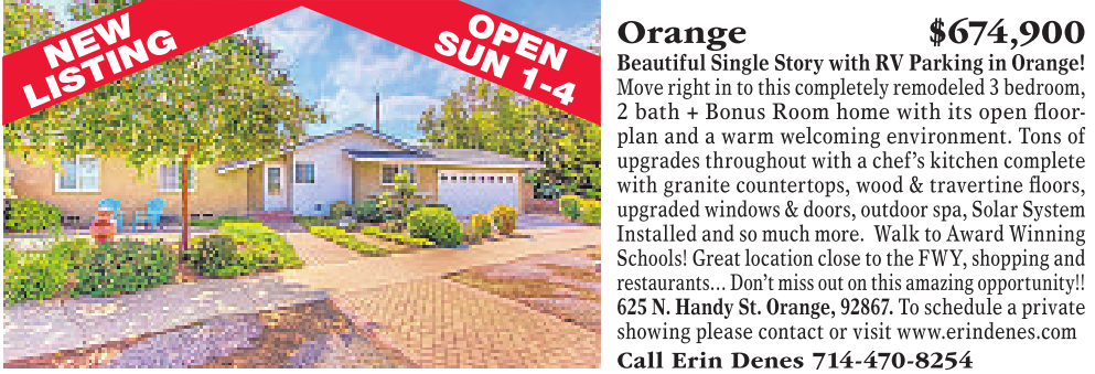 Move rightintothiscompletely remodeled3bedroom, 2 bath + Bonus Room home with its open floorplan and awarm welcoming environment. Tons of upgrades throughout with achef’s kitchen complete with granite countertops, wood &travertine floors, upgraded windows&doors, outdoorspa,Solar System Installed andsomuchmore. Walk to AwardWinning Schools! Greatlocationclose to theFWY,shoppingand restaurants… Don’tmissout on thisamazing opportunity!! 625 N. HandySt. Orange,92867. To schedule aprivate showing please contact orvisit www.erindenes.com