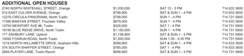 $1,030,000 SAT 12 - 3 PM 714 633 3600 $799,900 SAT & SUN 1 - 4 PM 714 633 3600 $799,000 SUN 1 - 4 PM 714 731 5900 $879,000 SUN 1 - 4 PM 714 633 3600 $429,000 SAT 1 - 4 PM 714 731 5900 $1,150,000 SUN 1 - 4 PM 714 731 5900 $1,148,800 SAT & SUN 1 - 4 PM 714 731 5900 $1,500,000 SUN 1:30 - 4:30 PM 714 731 5900 $599,900 SAT & SUN 1 - 4 PM 714 633 3600 $785,000 SAT 1 - 4 PM 714 633 3600 $699,900 SAT & SUN 1 - 4 PM 714 731 5900