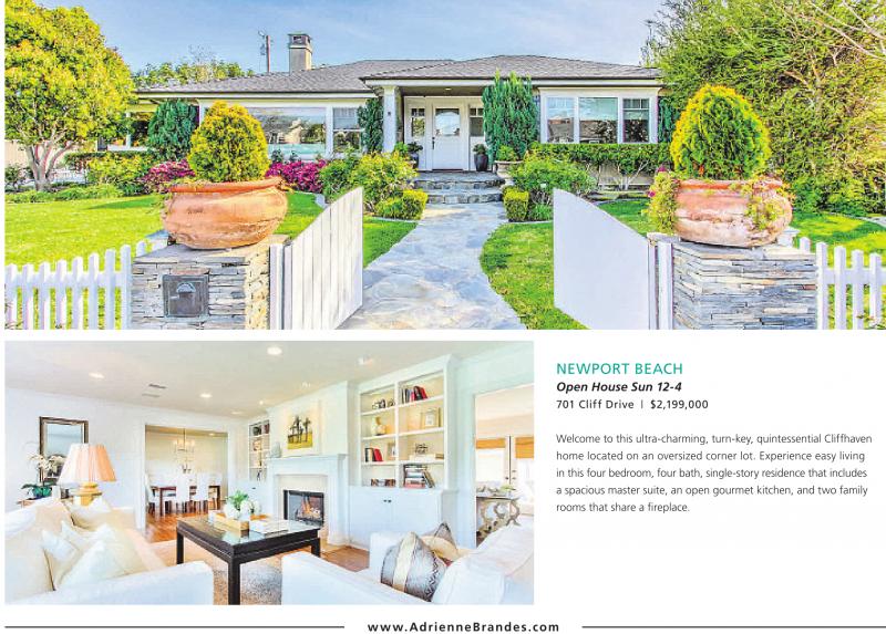 NEWPORT BEACH Open House Sun 12-4 701 Cliff Drive | $2,199,000 Welcome to this ultra-charming, turn-key, quintessential Cliffhaven home located on an oversized corner lot. Experience easy living in this four bedroom, four bath, single-story residence that includes a spacious master suite, an open gourmet kitchen, and two family rooms that share a fireplace. www.AdrienneBrandes.com