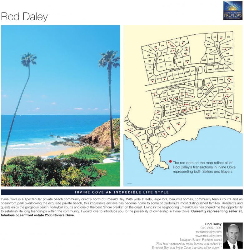 Rod Daley •The red dots on the map reflect all of Rod Daley’s transactions in Irvine Cove representing both Sellers and Buyers I R V I N E C O V E A N I N C R E D I B L E L I F E S T Y L E Irvine Cove is a spectacular private beach community directly north of Emerald Bay. With wide streets, large lots, beautiful homes, community tennis courts and an oceanfront park overlooking the exquisite private beach, this impressive enclave has become home to some of California’s most distinguished families. Residents and guests enjoy the gorgeous beach, volleyball courts and one of the best “shore breaks” on the coast. Living in the neighboring Emerald Bay has offered me the opportunity to establish life long friendships within the community. I would love to introduce you to the possibility of ownership in Irvine Cove. Currently representing seller at, fabulous oceanfront estate 2585 Riviera Drive. Rod Daley 949.395.1091 rod@roddaley.com www.roddaley.com Newport Beach Fashion Island “Rod has represented more buyers and sellers in Emerald Bay and Irvine Cove than any other agent.”