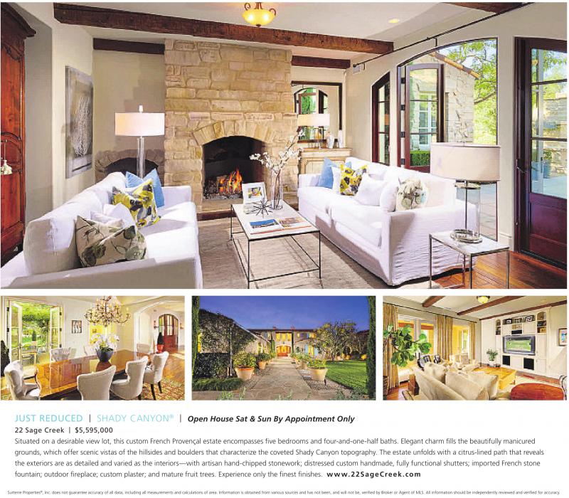 JUST REDUCED | SHADY CANYON ® | Open House Sat & Sun By Appointment Only 22 Sage Creek | $5,595,000 Situated on a desirable view lot, this custom French Provençal estate encompasses five bedrooms and four-and-one-half baths. Elegant charm fills the beautifully manicured grounds, which offer scenic vistas of the hillsides and boulders that characterize the coveted Shady Canyon topography. The estate unfolds with a citrus-lined path that reveals the exteriors are as detailed and varied as the interiors—with artisan hand-chipped stonework; distressed custom handmade, fully functional shutters; imported French stone fountain; outdoor fireplace; custom plaster; and mature fruit trees. Experience only the finest finishes. www.22SageCreek.com Surterre Properties ® ,Inc. does not guarantee accuracy of all data, including all measurements and calculations of area. Information is obtained from various sources and has not been, and will not be, verified by Broker or Agent of MLS. All information should beindependently reviewed and verified for accuracy.