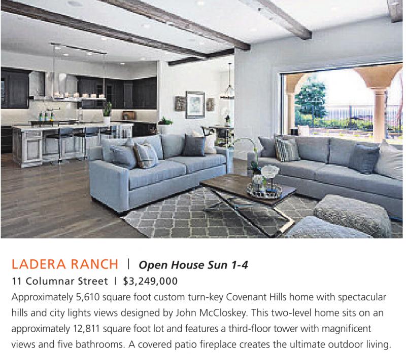 LADERA RANCH | Open House Sun 1-4 11 Columnar Street | $3,249,000 Approximately 5,610 square foot custom turn-key Covenant Hills home with spectacular hills and city lights views designed by John McCloskey. This two-level home sits on an approximately 12,811 square foot lot and features a third-floor tower with magnificent views and five bathrooms. A covered patio fireplace creates the ultimate outdoor living. See also