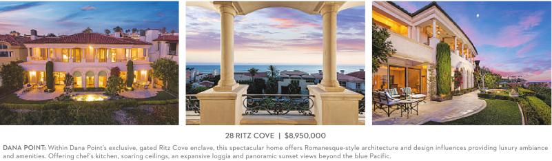 DANA POINT: Within Dana Point’s exclusive, gated Ritz Cove enclave, this spectacular home offers Romanesque-style architecture and design influences providing luxury ambiance and amenities. Offering chef's kitchen, soaring ceilings, an expansive loggia and panoramic sunset views beyond the blue Pacific.