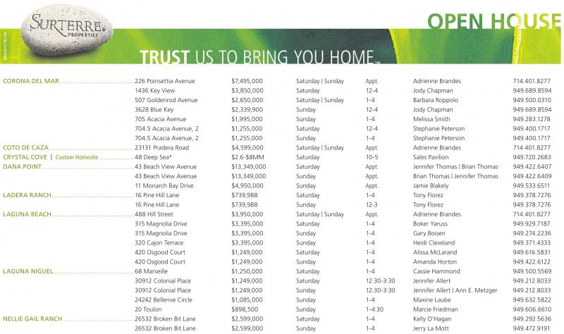 CORONA DEL MAR ...........................................226 Poinsettia Avenue $7,495,000 Saturday | Sunday Appt. Adrienne Brandes 714.401.8277 1436 Key View $3,850,000 Saturday 12-4 Jody Chapman 949.689.8594 507 Goldenrod Avenue $2,650,000 Saturday | Sunday 1-4 Barbara Roppolo 949.500.0310 3628 Blue Key $2,339,900 Sunday 12-4 Jody Chapman 949.689.8594 705 Acacia Avenue $1,995,000 Sunday 1-4 Melissa Smith 949.283.1278 704.5 Acacia Avenue, 2 $1,255,000 Saturday 12-4 Stephanie Peterson 949.400.1717 704.5 Acacia Avenue, 2 $1,255,000 Sunday 1-4 Stephanie Peterson 949.400.1717 COTO DE CAZA .................................................23131 Pradera Road $4,599,000 Saturday | Sunday Appt. Adrienne Brandes 714.401.8277 CRYSTAL COVE | CustomHomesite.....................48 Deep Sea* $2.6-$8MM Saturday 10-5 Sales Pavilion 949.720.2683 DANA POINT .....................................................43 Beach View Avenue $13,349,000 Saturday Appt. Jennifer Thomas | Brian Thomas 949.422.6407 43 Beach View Avenue $13,349,000 Sunday Appt. Brian Thomas | Jennifer Thomas 949.422.6409 11 Monarch Bay Drive $4,950,000 Sunday Appt. Jamie Blakely 949.533.6511 LADERA RANCH................................................16 Pine Hill Lane $739,988 Saturday 1-4 Tony Florez 949.378.7276 16 Pine Hill Lane $739,988 Sunday 12-3 Tony Florez 949.378.7276 LAGUNA BEACH................................................488 Hill Street $3,950,000 Saturday | Sunday Appt. Adrienne Brandes 714.401.8277 315 Magnolia Drive $3,395,000 Saturday 1-4 Boker Yaruss 949.929.7187 315 Magnolia Drive $3,395,000 Sunday 1-4 Gary Boisen 949.274.2236 320 Cajon Terrace $3,395,000 Sunday 1-4 Heidi Cleveland 949.371.4333 420 Osgood Court $1,249,000 Saturday 1-4 Alissa McLarand 949.616.5831 420 Osgood Court $1,249,000 Sunday 1-4 Amanda Horton 949.422.6122 LAGUNA NIGUEL...............................................68 Marseille $1,250,000 Saturday 1-4 Cassie Hammond 949.500.5569 30912 Colonial Place $1,249,000 Saturday 12:30-3:30 Jennifer Allert 949.212.8033 30912 Colonial Place $1,249,000 Sunday 12:30-3:30 Jennifer Allert | Ann E. Metzger 949.212.8033 24242 Bellerive Circle $1,085,000 Sunday 1-4 Maxine Laube 949.632.5822 20 Toulon $898,500 Sunday 1-4:30 Marcie Friedman 949.606.6610 NELLIE GAIL RANCH .........................................26532 Broken Bit Lane $2,599,000 Saturday 1-4 Kelly O’Hagan 949.292.5636 26532 Broken Bit Lane $2,599,000 Sunday 1-4 Jerry La Mott 949.472.9191