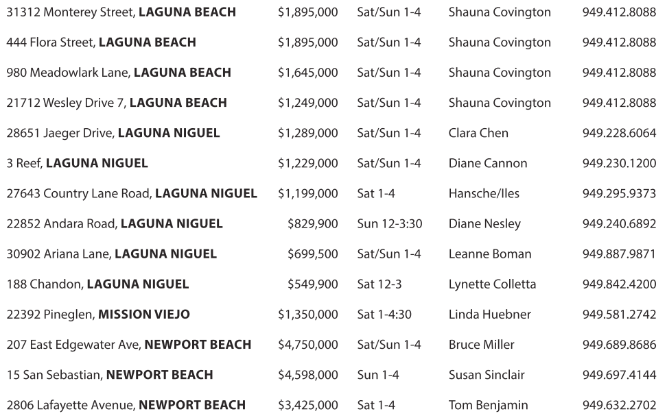 31312 Monterey Street, LAGUNA BEACH $1,895,000 Sat/Sun 1-4 Shauna Covington 949.412.8088