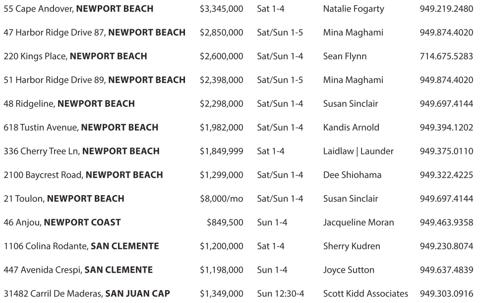 55 Cape Andover, NEWPORT BEACH $3,345,000 Sat 1-4 Natalie Fogarty 949.219.2480